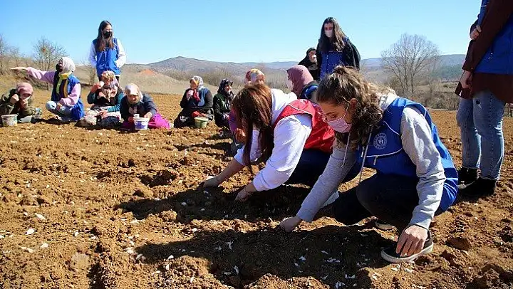 Kadınların yanına giden gençler, imece usulüyle dünyaca ünlü Taşköprü sarımsağının dikimine yardım etti.