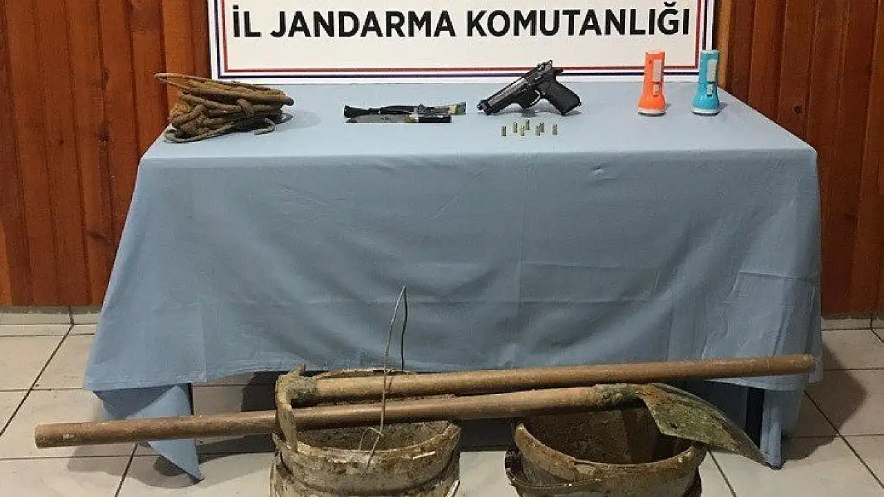Şahıslarla birlikte kurusıkı tabanca, 3 bıçak ve kazı yapmak için kullanılan çeşitli malzemeler ele geçirildi. Şüpheliler gözaltına alındı.