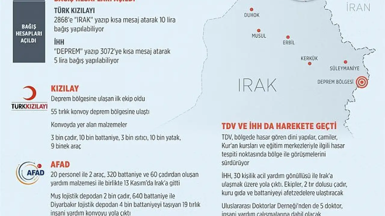 Irak-İran sınırında 12 Kasım'da yaşanan 7,3'lük depremin hemen ardından harekete geçen Afet ve Acil Durum Yönetimi Başkanlığı (AFAD), Türk Kızılayı ve sivil toplum kuruluşları, depremin yaşandığı ilk andan itibaren bölgeye binlerce koli insani yardım malzemesi sevk etti.