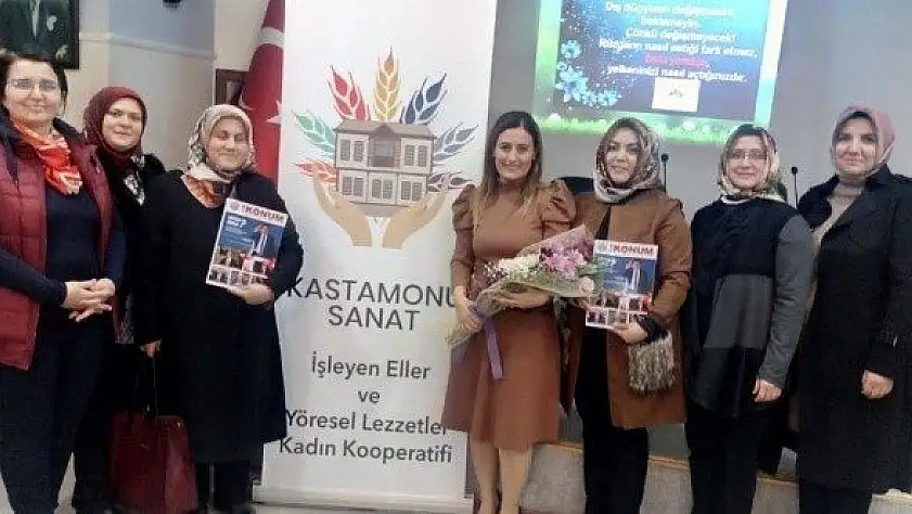 Konferansta konuşan Kastamonu Sanat İşleyen Eller ve Yöresel Lezzetler Kadın Kooperatifi Başkan Yardımcısı Serpil Durgut, 4 usta öğretici, 2 ev hanımı ve 1 çiftçi olmak üzere 7 kadınla bu yola çıktıklarını ifade ederek, “Bizler kursiyerlerimizin bizlere ‘Yapıyoruz ama değerlendiremiyoruz hocam’ demesiyle kadınlara öncülük etmek için yola çıktık. Kooperatif demek 7 kadının yan yana gelmesi demek. Gerçekten nasıl bir kuvvet nasıl bir büyüklük bizler yan yana geldiğimizde ve siz değerli Kastamonu halkının bizlere gösterdiği ilgiyle daha iyi anladık. Kooperatif olarak hedefimiz sadece kadınlarımızın yaptığı işlere aracılık edip sunmak değil engelli bireylerimize, LÖSEV’li çocuklarımıza yardım etmek, hizmet vermek. Halkımıza bu tür konferanslar düzenleyerek daha çok bilgi sahibi ederek aile olarak sosyal yaşam olarak bilinçlendirmek amacıyla yola çıktık. Bugün bunun ilkini gerçekleştirmiş olmanın mutluluğunu yaşıyoruz. Adam olmadan önce insan olabilmenin en temel unsurudur kadın. Çoğu zaman değil her zaman her gözün nuru hayatın can damarıdır kadın. İnsanlığın devamı için olmazsa olmazdır. En büyük dertlerin dertlisi en büyük mutlulukların ardındaki gizli kahramandır kadın. Küçük şeylerden mutlu olan mutlu olduğunda da mutlu olmasına sebep olanı unutmayandır kadın. Hep zarar görüp kimseye zarar vermeyen kişidir kadın, bazen hiçbir suçu yokken ölüme terk edilen bazen küçük yaşta gelin verilen, her türlü kabağın başına patlatıldığı yazgısı kara olandır kadın bazen. Ve en önemlisi Kastamonu ya da temsil ederek şehit tabutuna sarılmış gözyaşı döken şehit anasındır eşidir kadın. Asla düşmana boyun eğmeyen bebeği sırtında kurtuluş savaşında mermi taşıyandı En asil alın terinin muhteşem sahibidir kadın” dedi.