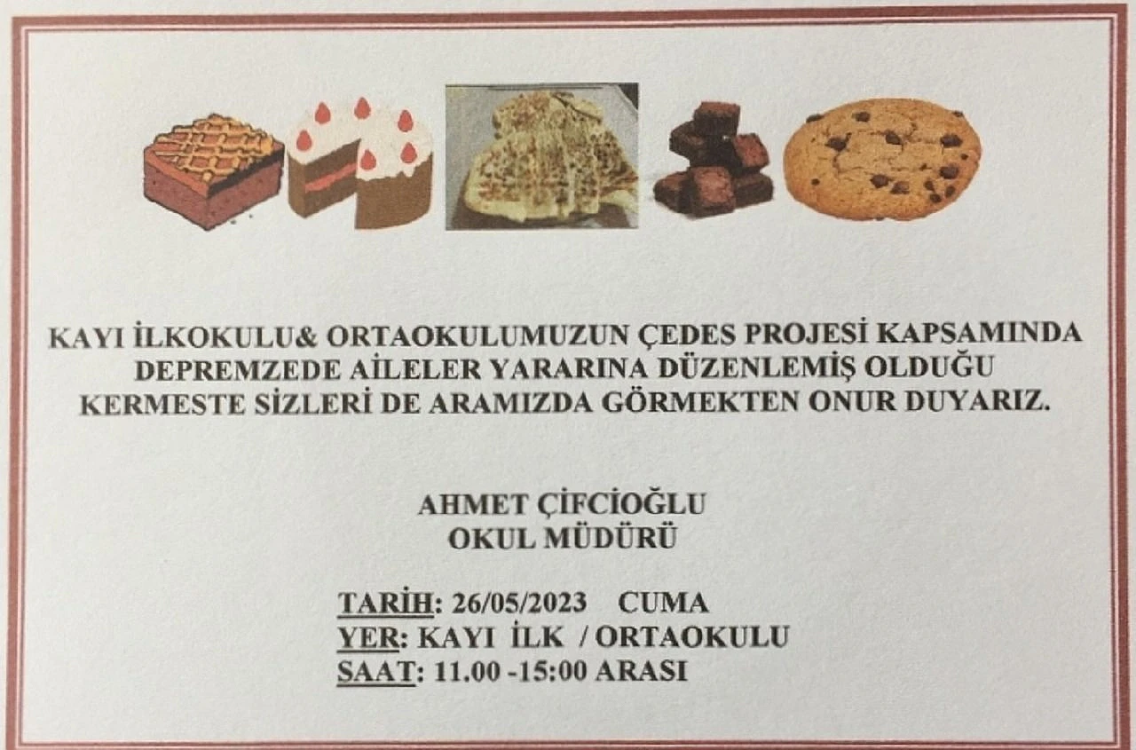 Okul Müdürü Ahmet Çifcioğlu yaptığı açıklamada, Kayı İlkokulu ve Ortaokulumuzun ÇEDES Projesi kapsamında depremzede aileler yararına düzenlemiş olduğu kermese herkes davetlidir. Aramızda görmekten onur duyarız." dedi.