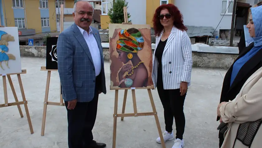 İlçe merkezinde düzenlenen sergide resim, ahşap boyamaya ve dokuma ürünlerden oluşan 100 eser bulunuyor.