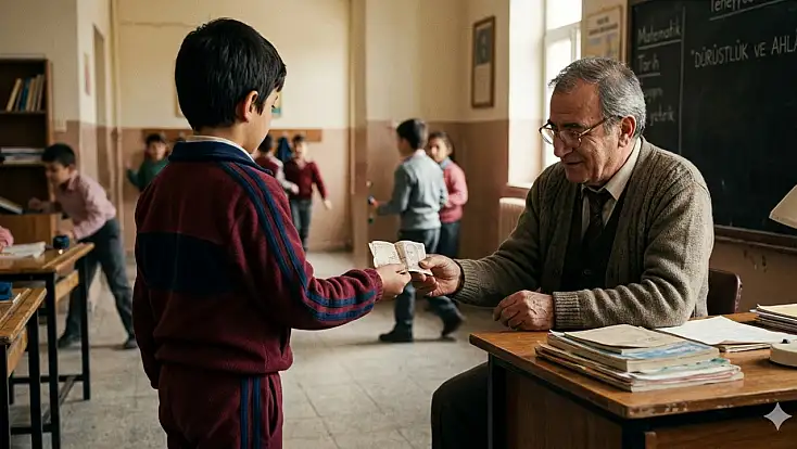 Aradan yaklaşık iki ay geçti. Bir gün aynı öğrenci öğretmeninin yanına geldi. Elinde katlanmış bir para vardı. Öğretmenine uzattı.